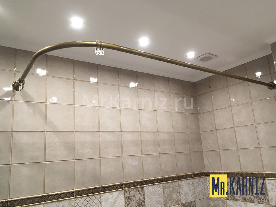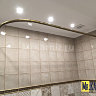 Классический вариант, редко используемый при обустройстве душевых. Прямые карнизы лучше смотрятся на ваннах, контактирующих с тремя стенами. Душевые поддоны обычно компактнее, поэтому не граничат со стенами с трех сторон даже в небольших комнатах.